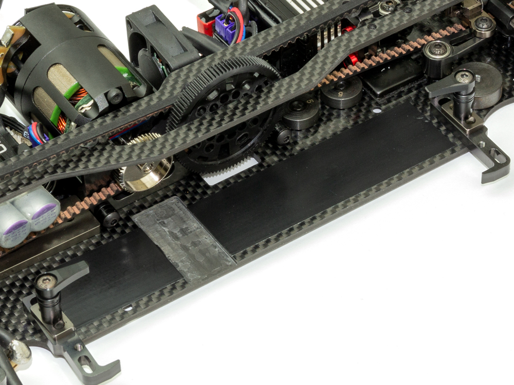 This is a 0.15mm-thick Teflon tape. Put this very thin tape between a chassis and batteries, and it will reduce the friction between the chassis and the batteries, prevent chassis flex, and make the drive feeling more natural. This extra thin Teflon tape minimizes the roll amount change to be made by higher center of gravity.
