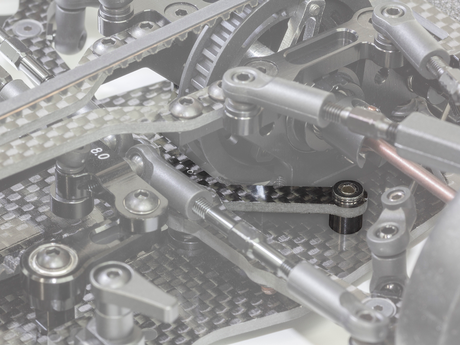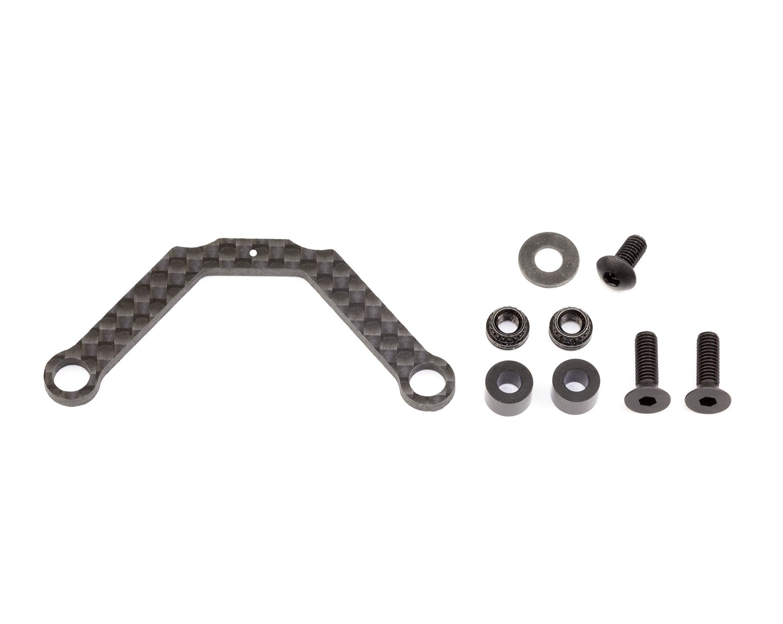Chassis brace for IF14 Speciale. Flex adjustment freely Dedicated braces to optimize chassis flex characteristics near the front and rear bulkheads. It can be easily attached and detached with two screws, and the setup can be changed quickly depending on the driving situation. The material is 2mm thick high-quality carbon graphite, achieving both rigidity and flexibility.